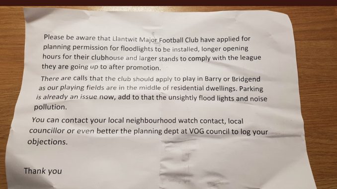 The letter, in which they has voiced their displeasure over about Llantwit Major AFC’s stadium improvement plans, has had the opposite affect with the club receiving support from many in the town.